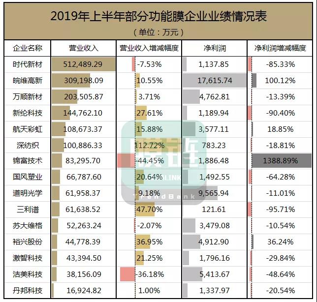 2019年上半年各功能膜企业绩一览