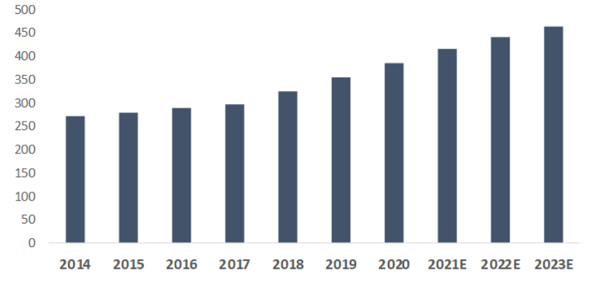 光学膜下游应用产品范围不断扩大,液晶模组需求逐年增加,带动光学膜市场需求开启下一个快速增长期。我国各类面板的出货量近几年呈稳步上升态势,根据头豹研究院数据测算,中国光学膜市场规模将从2019的354亿元增长至2023年的463.8亿元,2019-2023年的CAGR达7%。