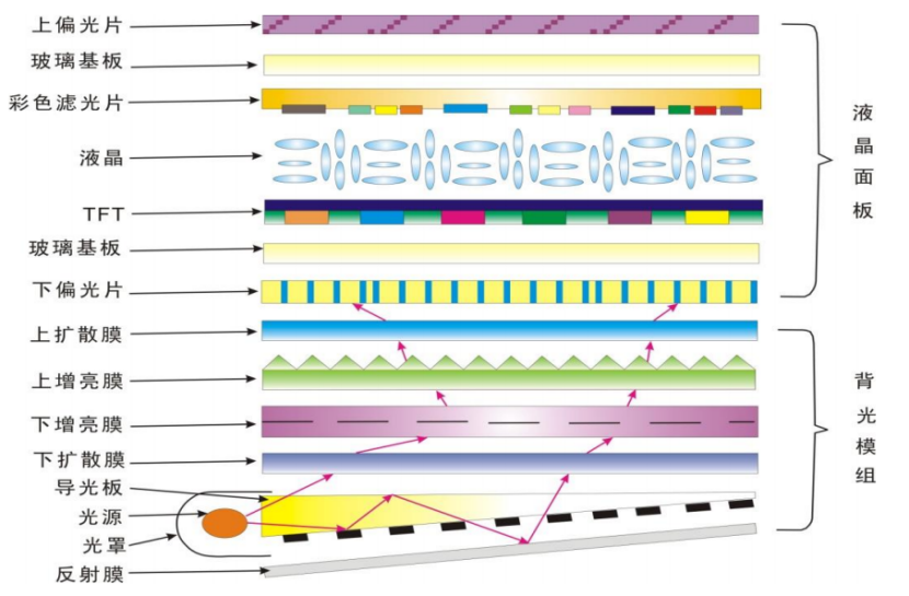 液晶显示面板光学膜主要包括2张偏光片、2张配向膜和1张彩色滤光片;由于液晶面板本身不发光,需要背光模组作为发光源,一般一组背光模组由2张增亮膜、2张扩散膜和1张反射膜构成。