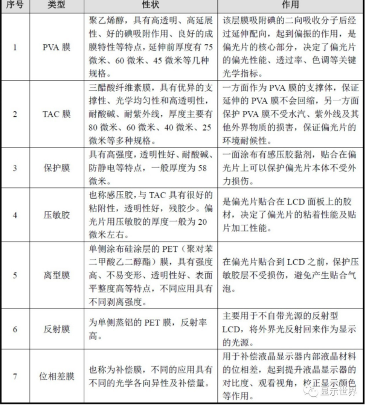构成偏光片的各种主要膜材所具备的特性及作用如下表所示: