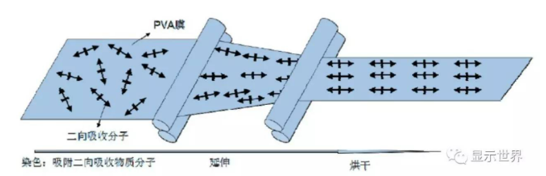 PVA (polyvinyl alcohol)膜全称聚乙烯醇薄膜,其组分主要是碳氢氧等轻原子,因此具有高透光和高延展性等特点。将PVA膜在染色槽中染色后,其表面会均匀的富集一层碘分子(或染料分子)。未经处理的PVA分子链呈杂乱分布,此时吸附其上的碘分子(或染料分子)也杂乱分布;当PVA经外力作用拉伸后,PVA分子链延外力方向分布,此时碘分子(或染料分子)也有序分布,从而使PVA膜具备了偏光的功能。PVA膜拉伸及碘分子(或染料分子)排列情况如下表所示: