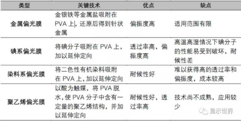目前市场上的偏光片可依据PVA膜上起到偏光作用的二向性分子不同来分类,主要包括金属偏光膜、碘系偏光膜、染料系偏光膜和聚乙烯偏光膜等。其中碘系偏光膜由于透光率和偏振度高,是目前应用较广的偏光膜。