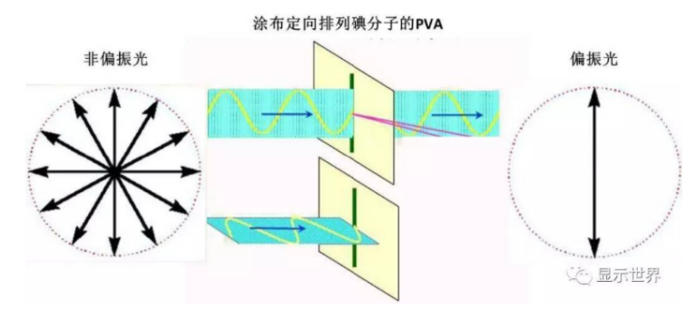 在平行的碘分子(或染料分子)之间,存在相互平行的间隙,这些间隙将允许偏振方向与碘分子(或染料分子)排布方向相同的光束通过,而阻止其他偏振方向的光束通过,也即将非偏振光过滤成为了偏振光。