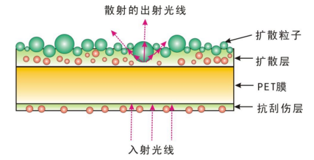 扩散膜主要由三层结构组成,包括最下层的抗刮伤层、中间的透明 PET 基材层和最上层的扩散层。扩散膜的工作原理是:光线从最下方的抗刮伤层入射,再穿透高透明的 PET基材,然后,被分散在扩散涂层中的扩散粒子所散射形成均匀的面光源。扩散粒子多数为球状,其功能类似于凸透镜,光线在经过这些粒子时被聚焦到一定的出射角度内,从而达到增强出射光亮度的功能。此外,扩散层中粒径大小不同的粒子也保证了光线不会从扩散膜中直射出去,从而起到了雾化的效果。