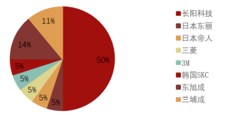 全球反射膜市场主要包括长阳科技、日本东丽、日本帝人、韩国SKC、东旭成、兰埔成等,长阳科技自2012年第一条光学级反射膜生产线成功量产后,市场份额持续扩大,2020年公司反射膜全球市场份额约50%。