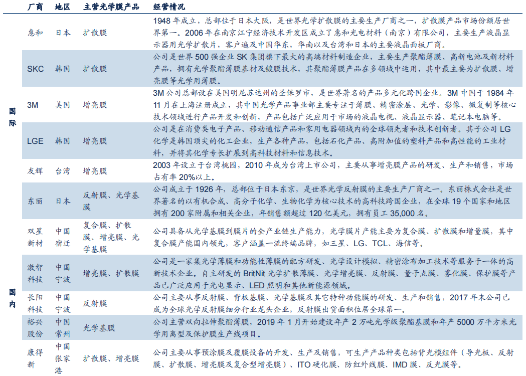 全球重要的扩散膜生产厂家包括日本的惠和、智积电、Kimoto;韩国的SKC和Shinwha Intertek;台湾的华宏新技和伸昌光电;大陆的激智科技、东旭成和乐凯股份等。
