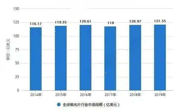 偏光片主要应用在仪器仪表、液晶电视、汽车电子、手机等消费类及工控类电子显示屏面板领域,在全球市场上,偏光片主要用于电视、智能手机及平板电脑,而电视占据约90%的市场份额。2014年至2019年期间,全球偏光片市场规模由2014年的116.17亿美元稳步增长至2019年的121.35亿美元,年复合增长率为0.9%。