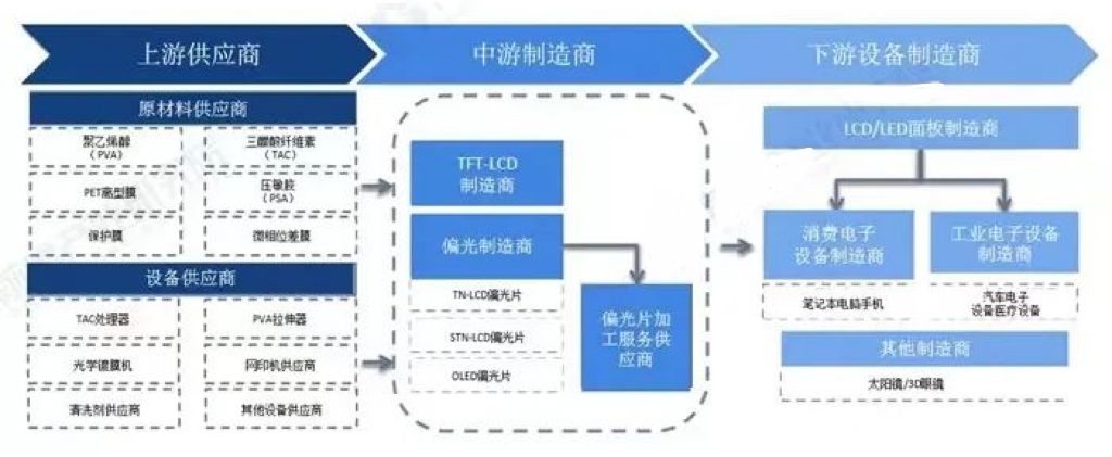 偏光片为液晶显示面板关键原材料,配置于显示模组上下两侧。偏光片是将聚乙烯醇(PVA)膜和三醋酸纤维素(TAC)膜经拉伸、复合、涂布等工艺制成的一种高分子材料,其全称为偏振光片,可控制特定光束的偏振方向。例如在液晶显示模组中有两张偏光片分别贴在玻璃基板两侧,下偏光片将背光源产生的光束转换为偏振光,上偏光片解析经液晶电调制后的偏振光,产生明暗对比,从而产生显示画面。液晶显示模组的成像必须依靠偏振光,少了任何一张偏光片,液晶显示模组都不能显示图像。偏光片作为各种电子产品必不可少的部件,由于它又轻又薄,有足够的强度和韧性,可以做得很大,偏振片能方便地进行大规模工业化生产,因而使偏光片在工业、科技、交通以及人们的日常生活中得到了广泛的应用,目前市场的需求量已经超出人们想象。