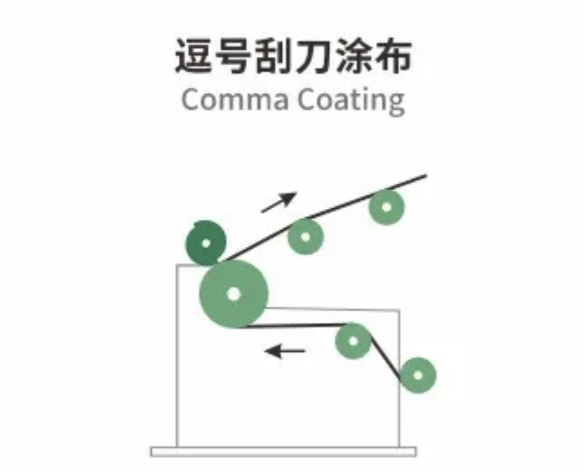 ①逗号刮刀涂布工艺:适用于高粘度胶液,较厚的涂层涂布、涂布表面平整,涂布厚度(湿胶)20~450μm,胶液粘度为1000~50000cps。多在保护膜、功能胶带、多功能涂布等方面使用。