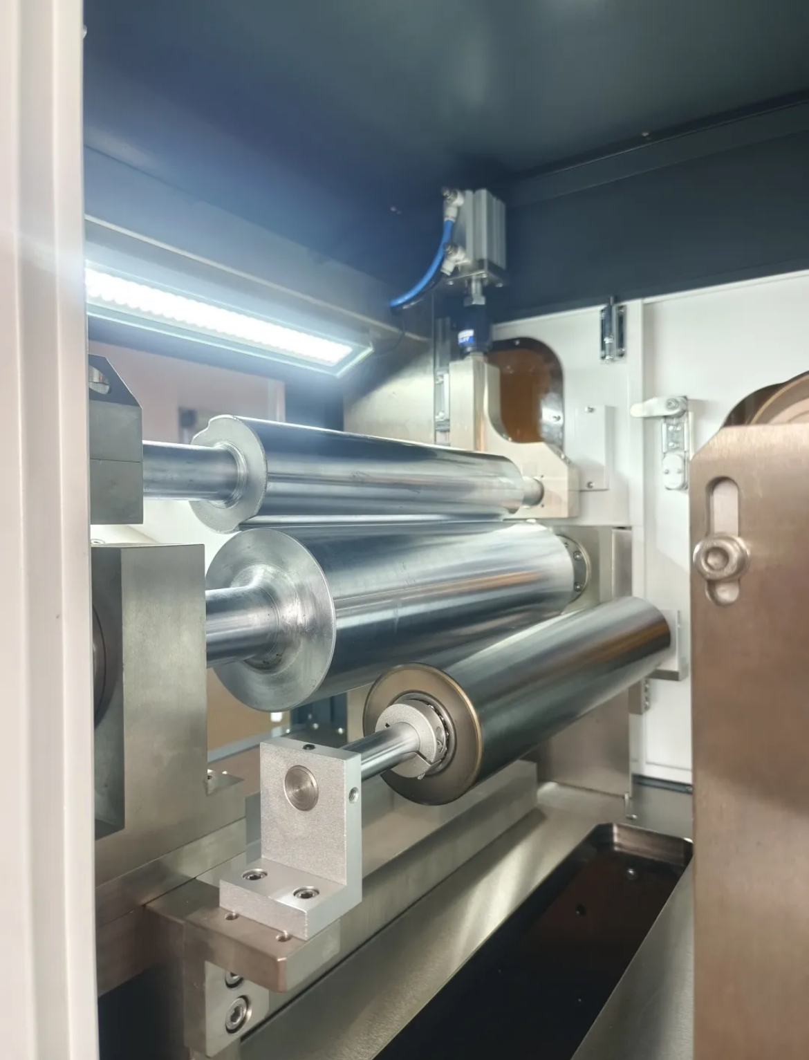 4)涂布胶辊:胶辊是指涂布质量的一个重要变量,其材质(如胶层寿命)、硬度、形位公差、刚性、动静平衡质量、表面质量、受热变形状况等也都影响到涂布的均匀性。
