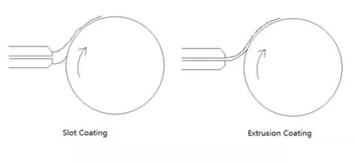 ④挤压式涂布工艺:挤压涂布为流体通过挤压经过有特殊流道的涂布头涂覆在运动的基材上。根据涂布头与基材距离及形成的涂布头与基材之间的流体形态分为狭缝式挤压涂布(Slot Coating)和挤压式涂布(Extrusion Coating),如下图所示。
