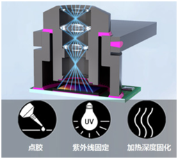7)既然有些组件不能透光,那么需要热固化,但是通常热固时间偏长,为了满足高效的生产流水线组装,那么就要引入UV光固,而有的位置UV光找不到,所以这类产品通常选择UV+热固的双重固化方式。