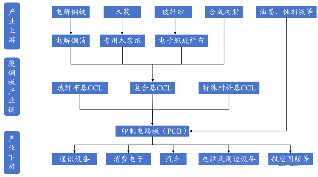 覆铜板上游主要系铜箔、树脂和玻纤布等原材料,成本分别在42%、26%和19%左右,其下游主要为PCB,占PCB的制造成本约3成左右。