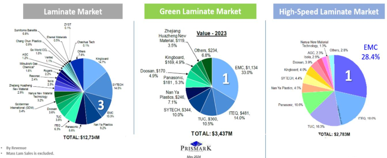 2)高速覆铜板:目前主要被台系、日系厂商所占领,2023年市场份额最高的前三大厂商台光EMC、联茂ITEQ、台耀TUC均为台系厂商。